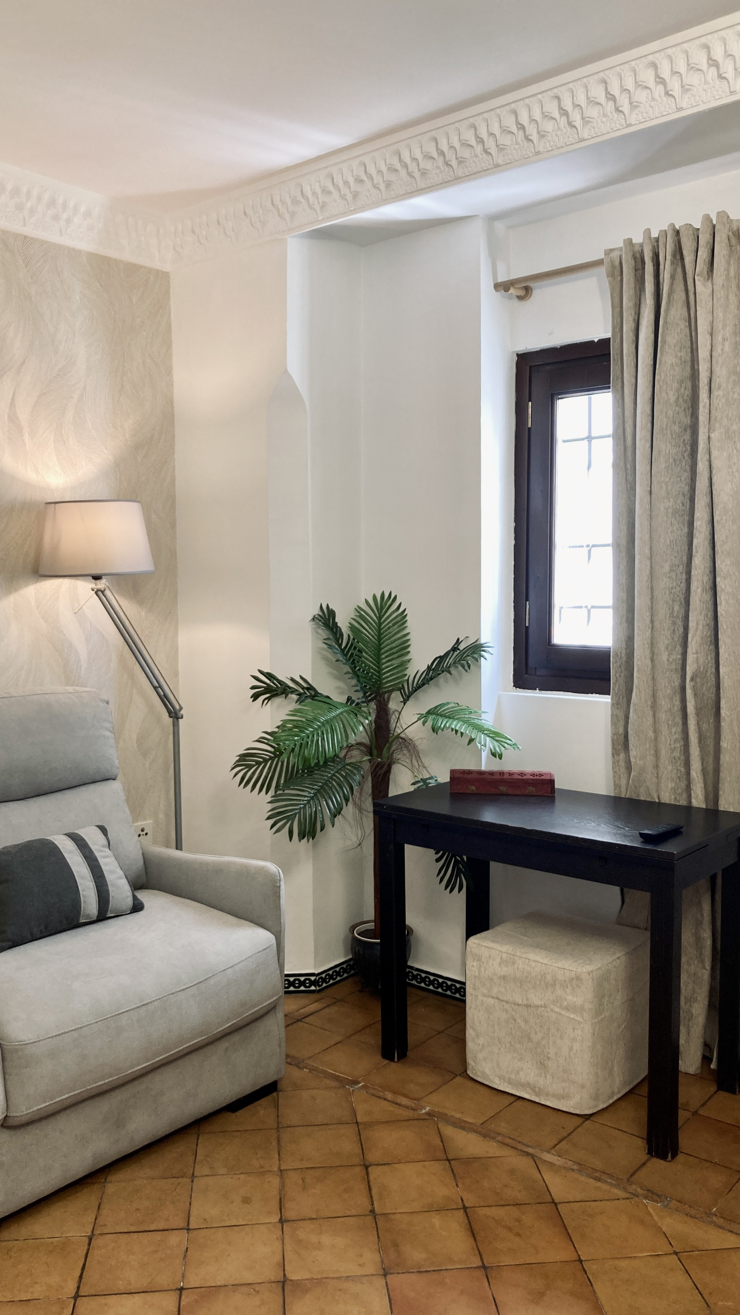 Con una decoración cálida y envolvente, este espacio está diseñado para disfrutar sin complicaciones. Tiene una pequeña zona de cocina auxiliar, baño completo y acceso, como todos nuestros huéspedes, a la terraza comunitaria con vistas increíbles a la Alhambra.