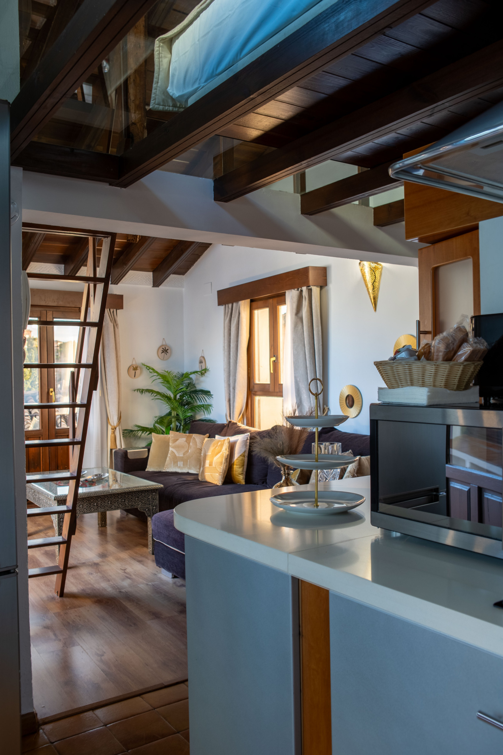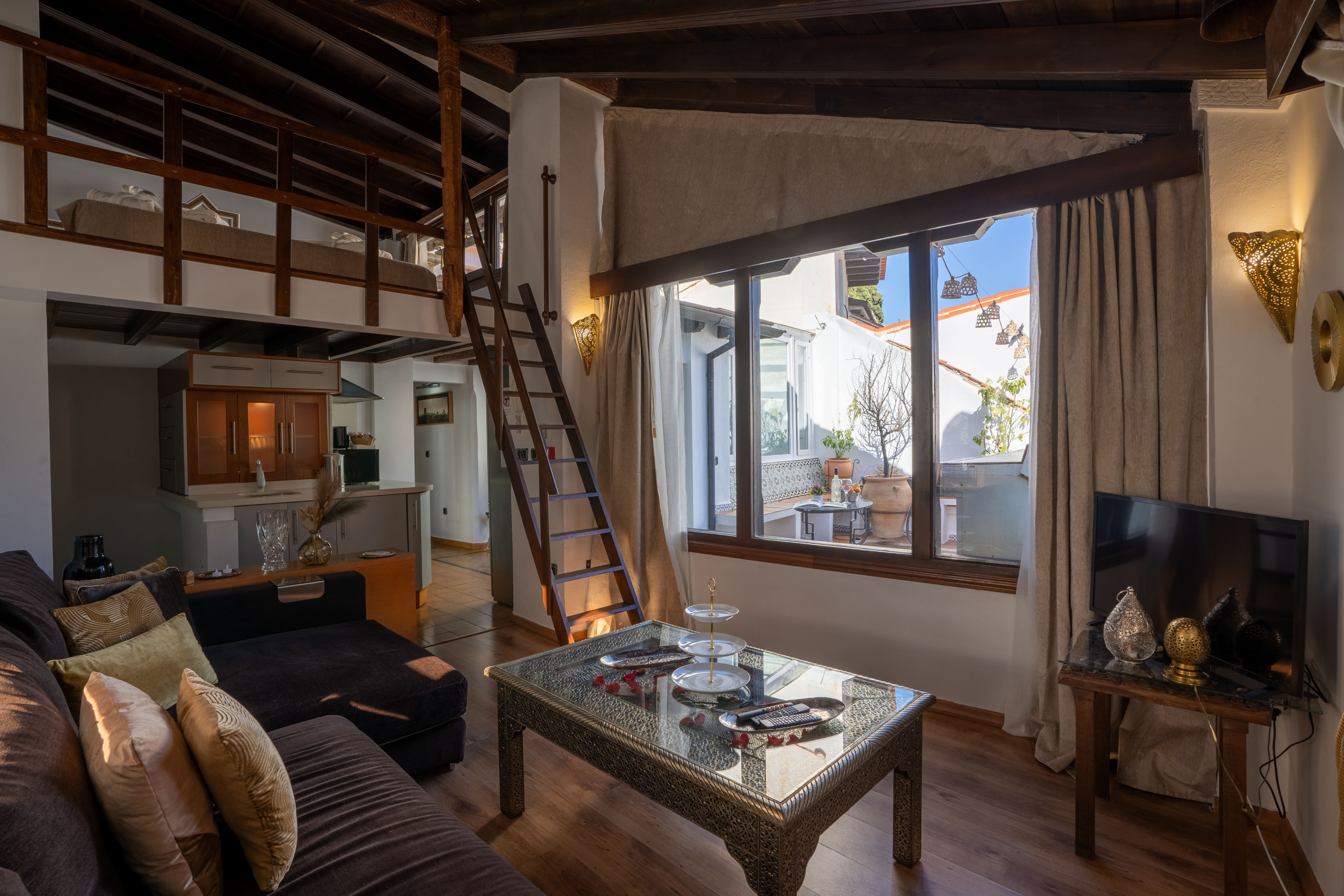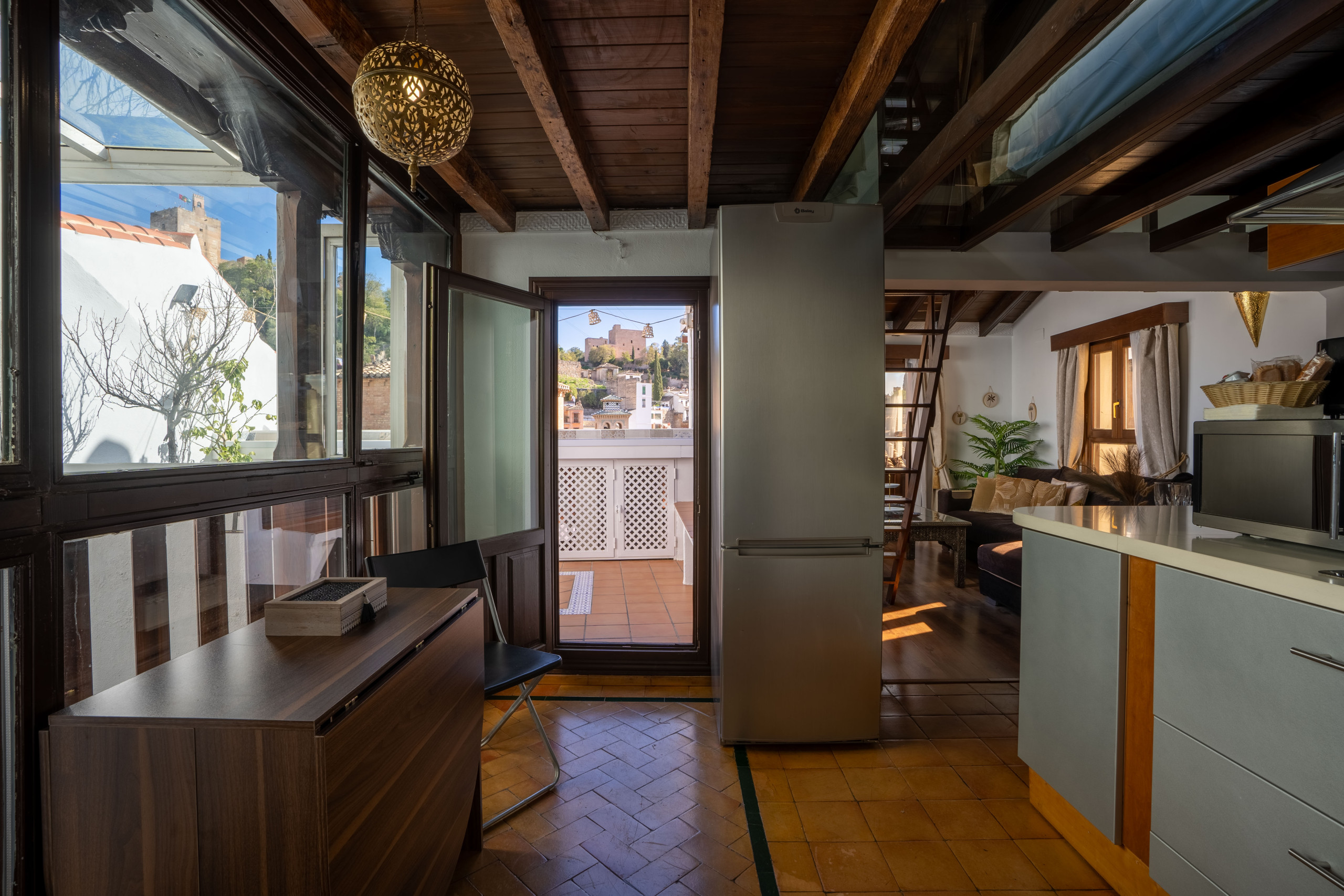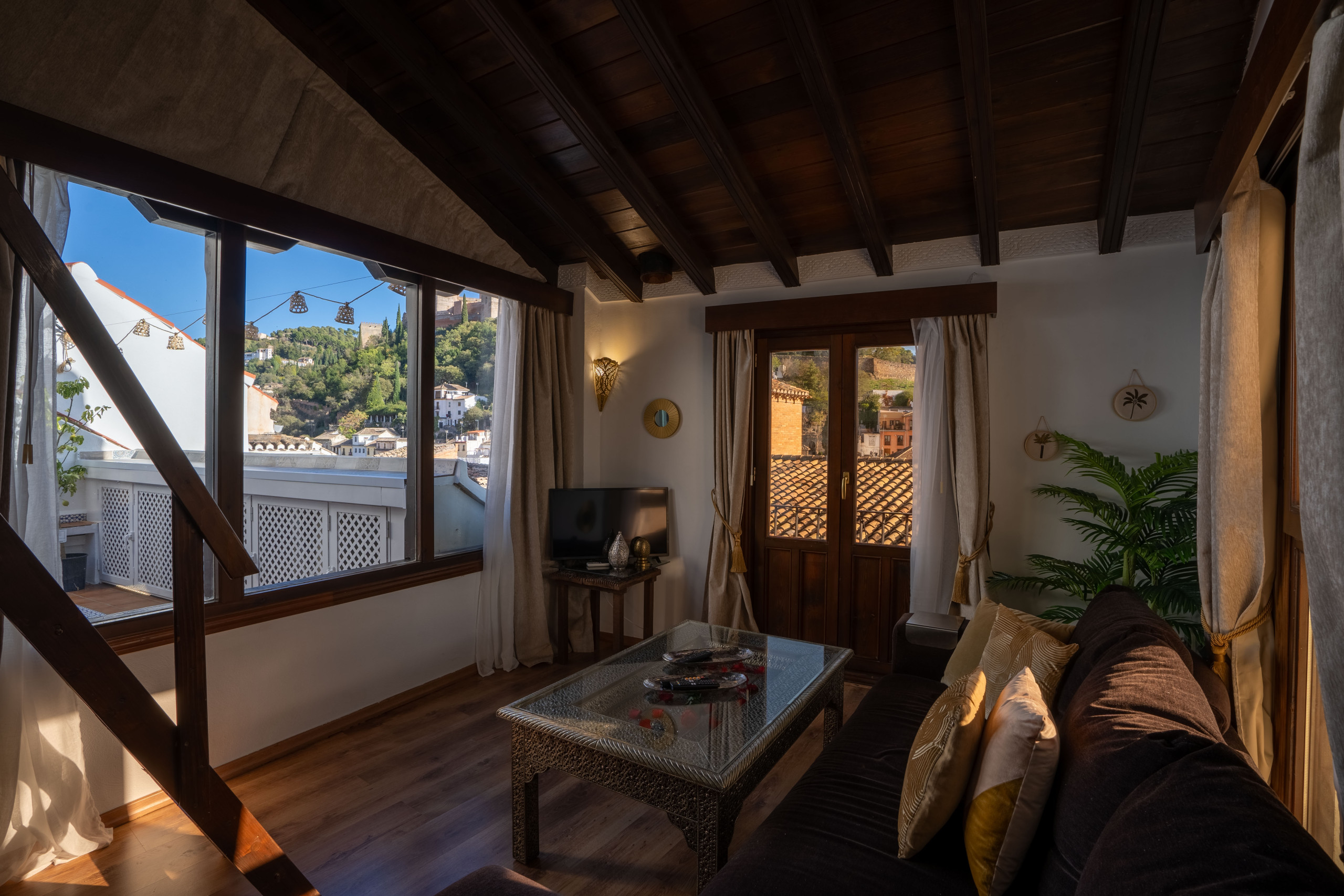 It has an independent bedroom, living room with sofa bed, fully equipped kitchen, complete bathroom with rain effect shower and, of course, a private terrace with jacuzzi from where you can watch the sunset in front of the Alhambra. No noise, no interruptions. Just you, Granada... and the magic.