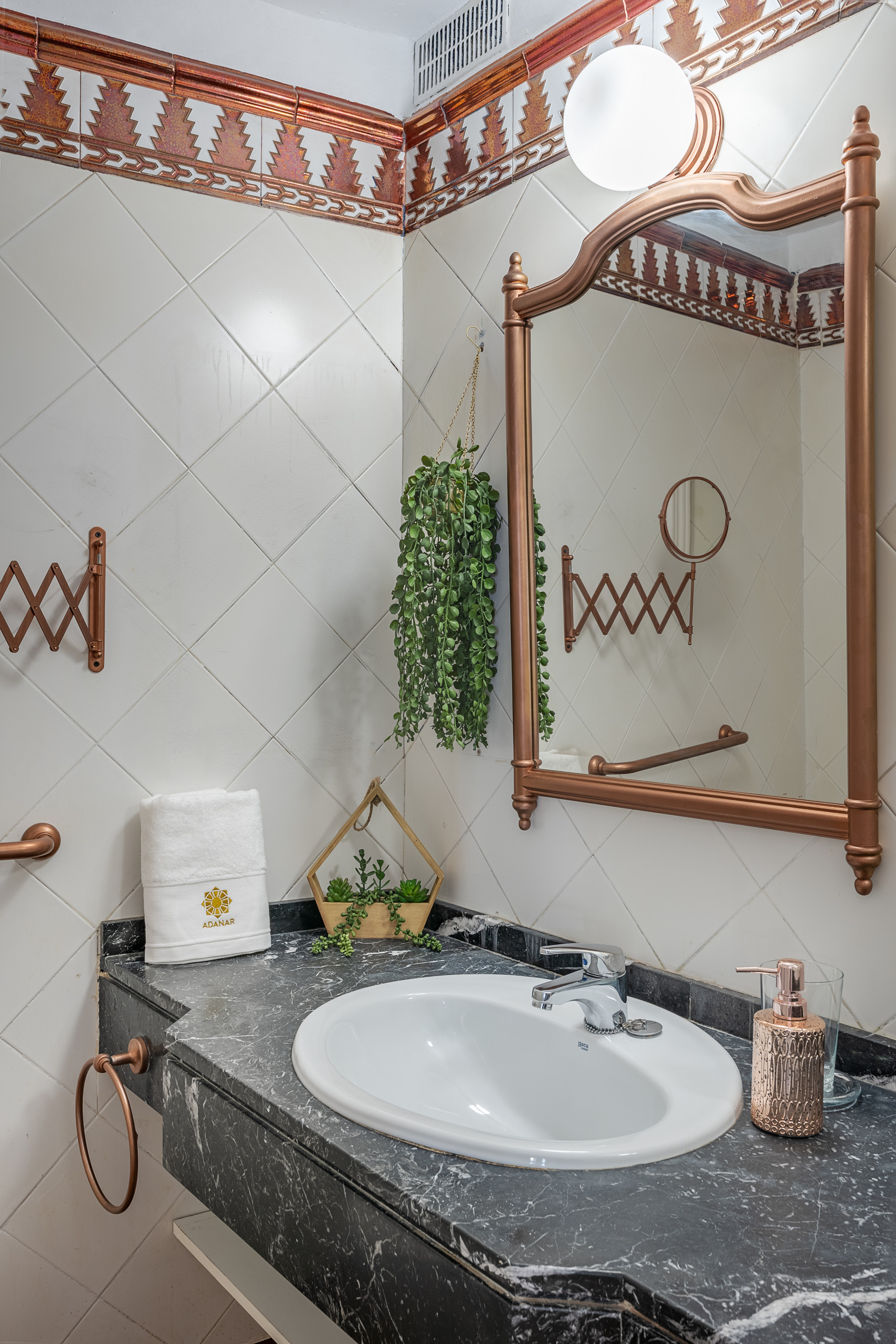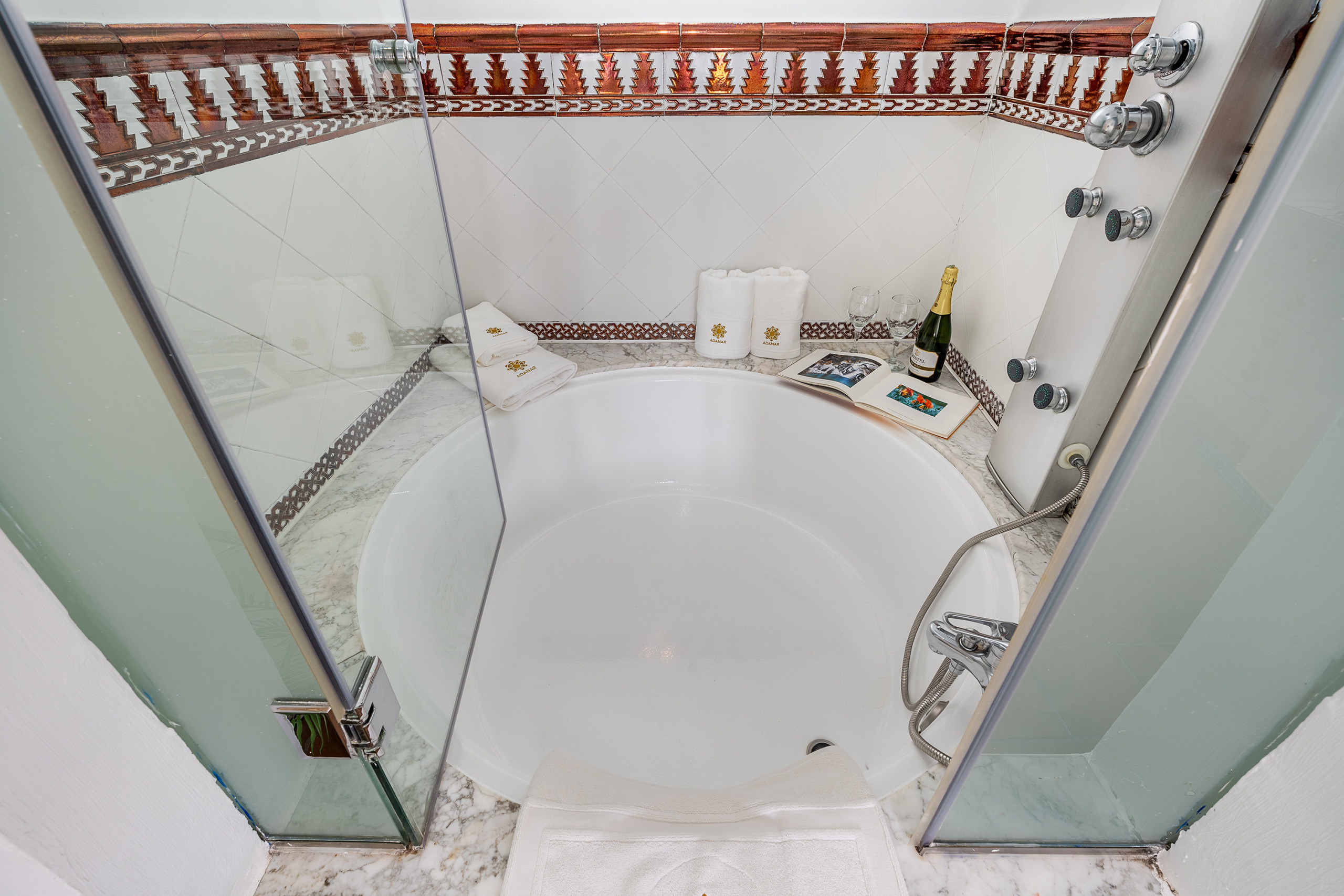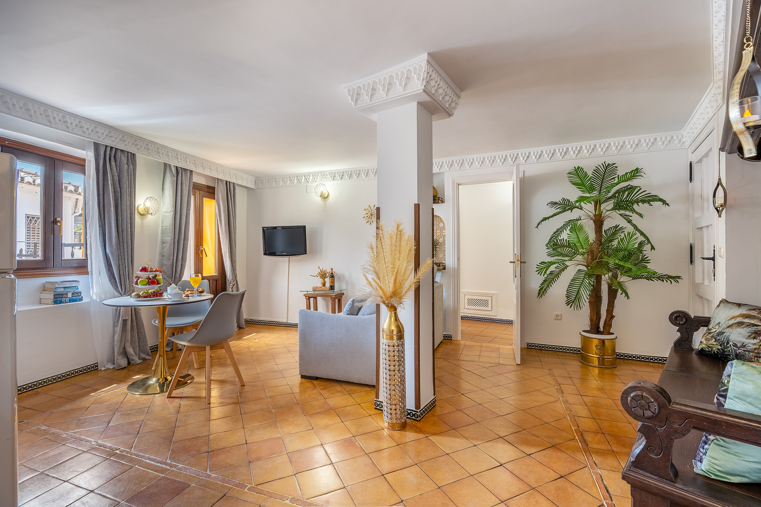 Every corner of this apartment is designed to experience Granada with all five senses. The circular bathtub next to the bed invites you to stop time, relax, and share unique moments. And the balcony, with direct views of the Alhambra, is that small luxury that turns each sunrise and each drink at sunset into something unforgettable.