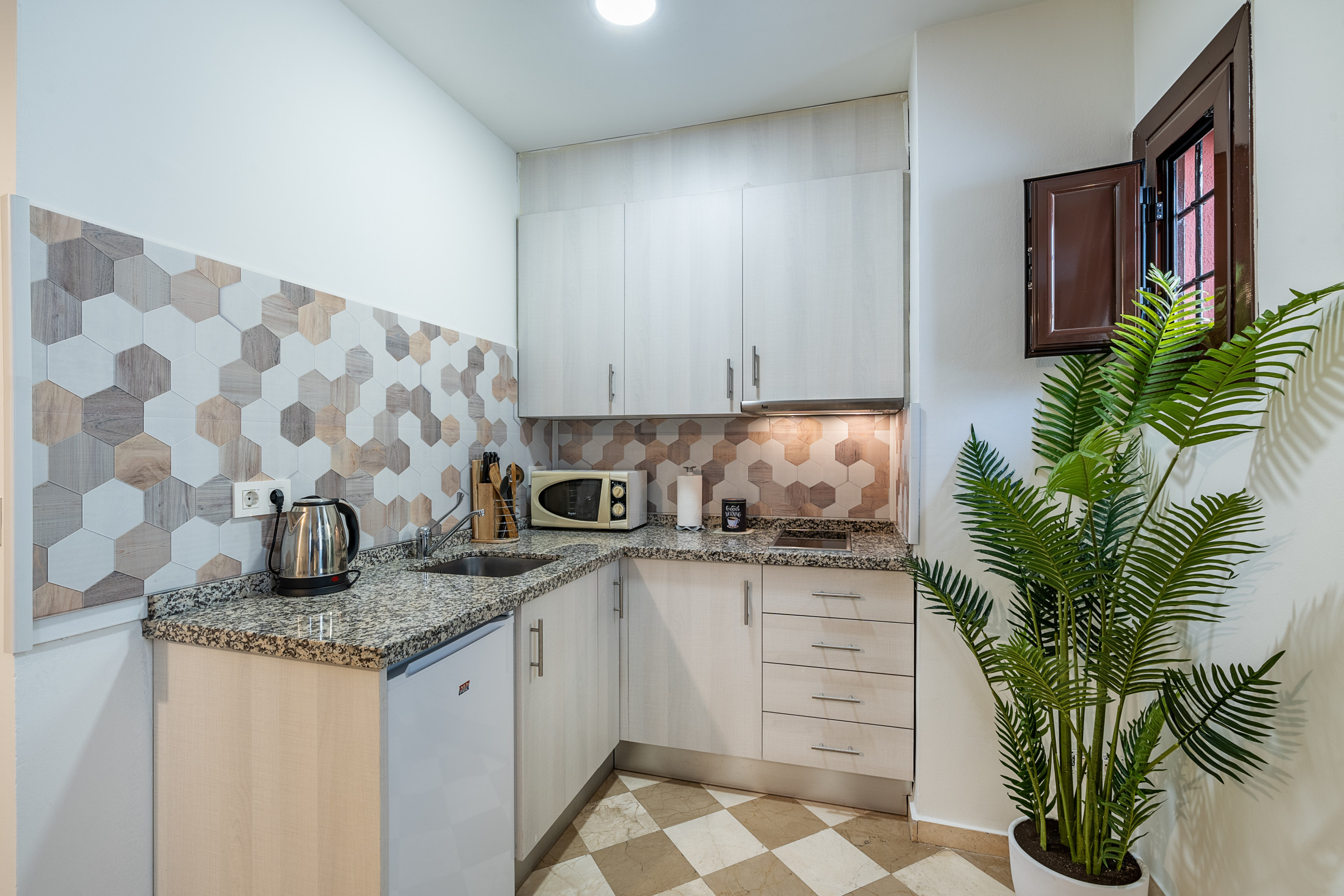 With a warm and enveloping decoration, this space is designed to enjoy without complications. It has a small auxiliary kitchen area, full bathroom and access, like all our guests, to the communal terrace with incredible views of the Alhambra.