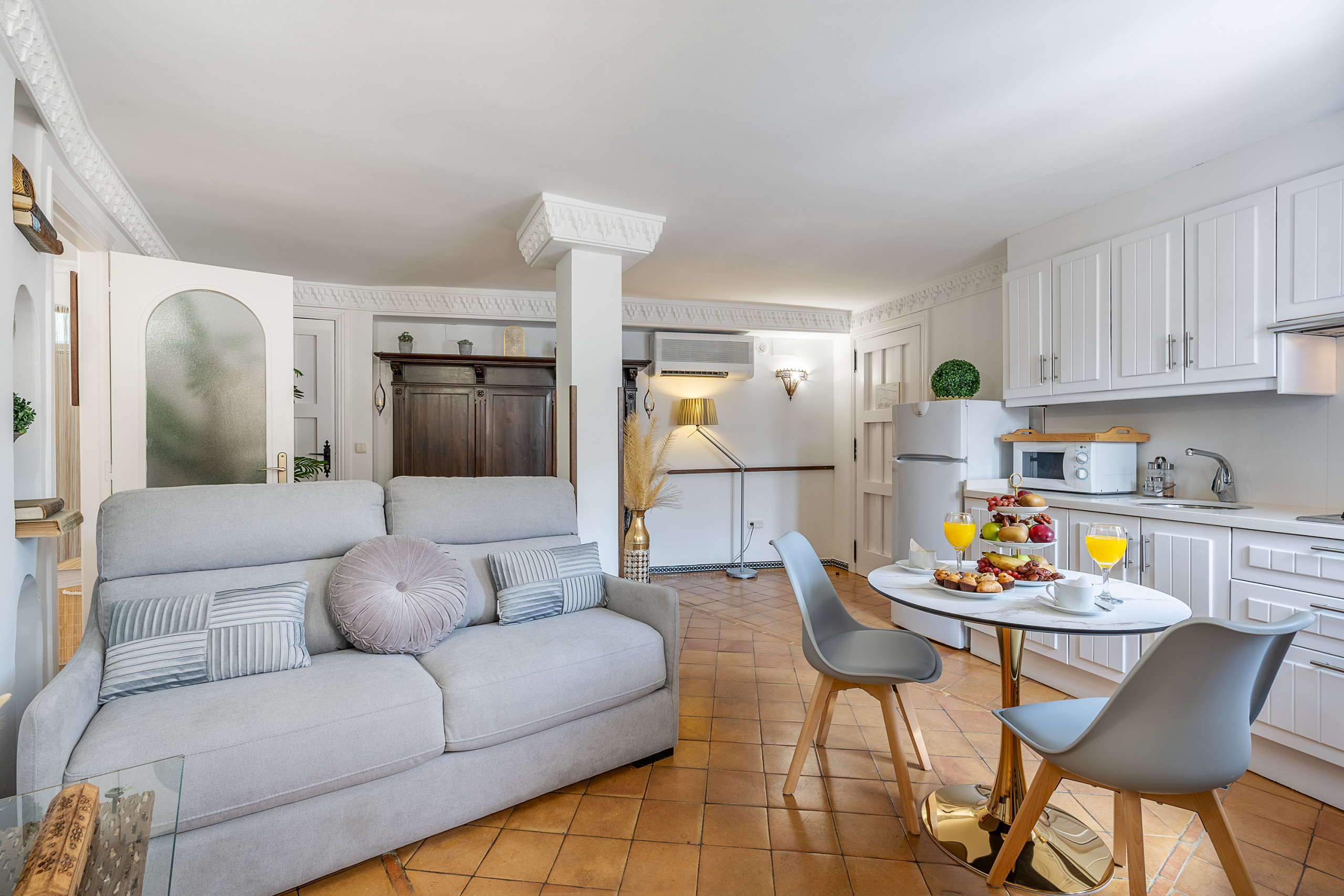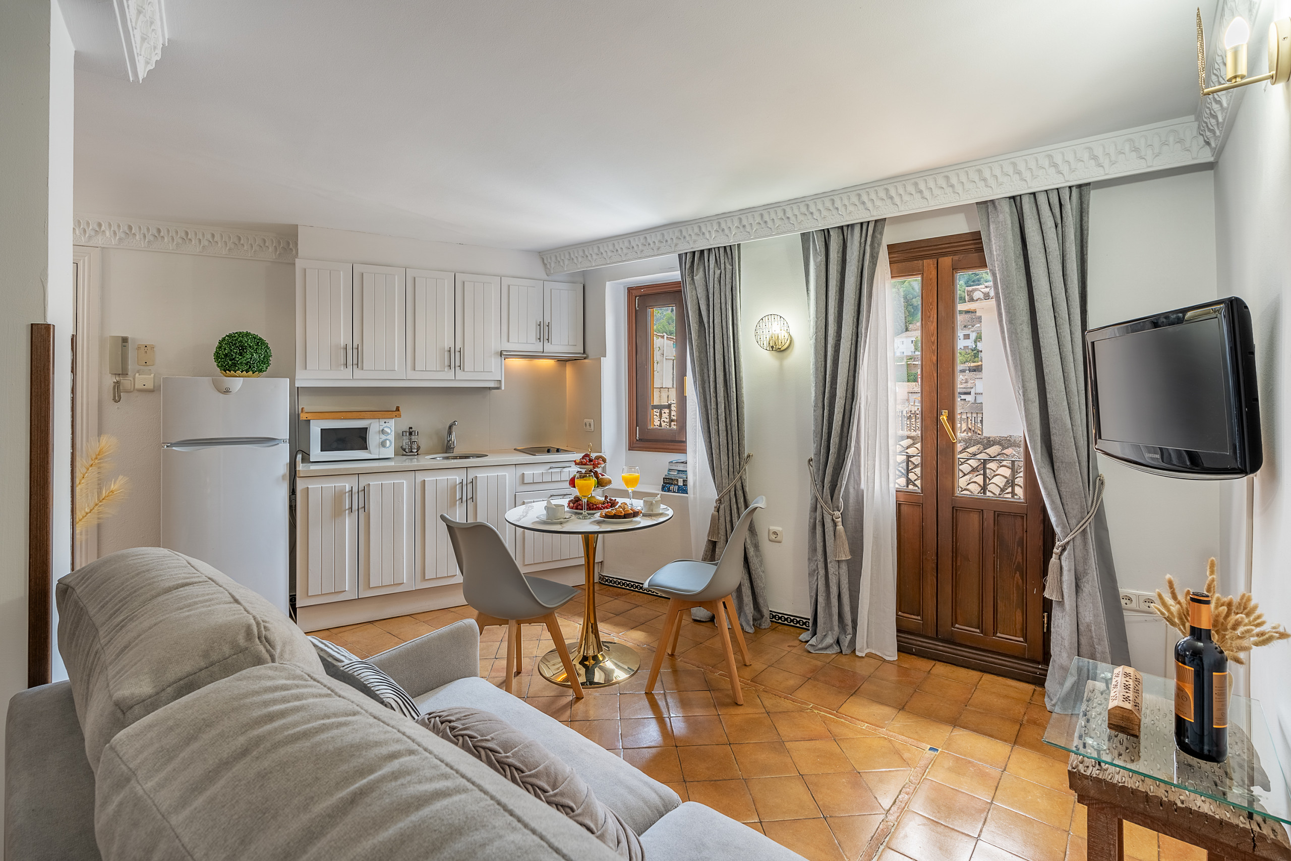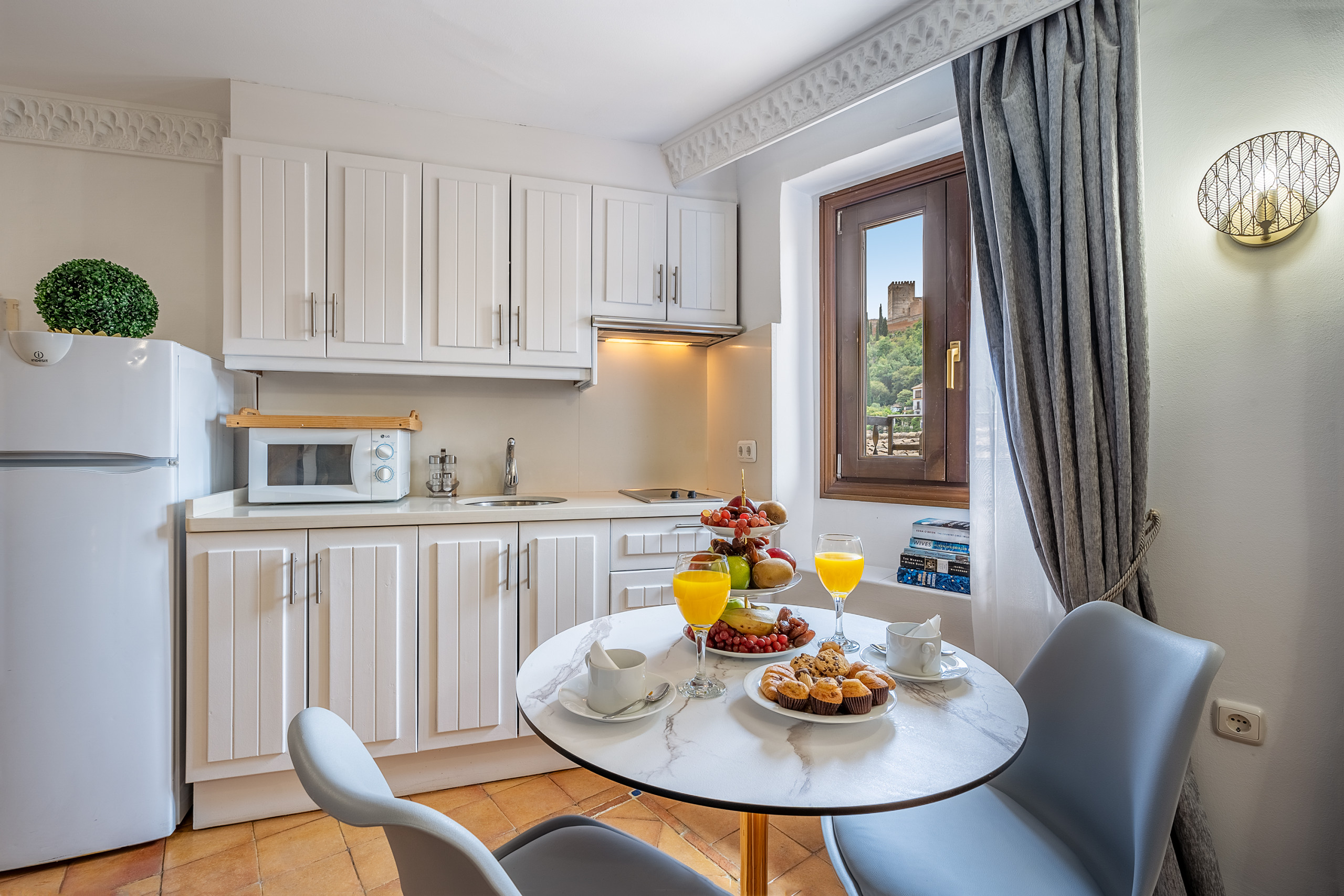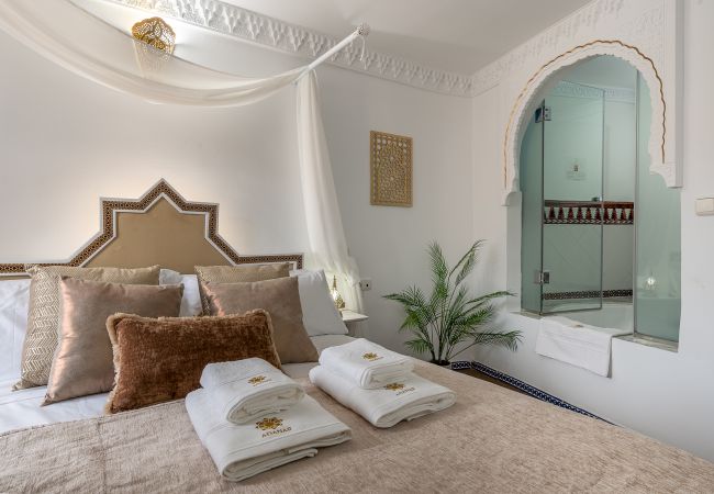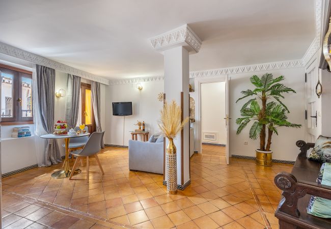 Chaque coin de cet appartement est pensé pour vivre Grenade avec les cinq sens. La baignoire circulaire près du lit invite à arrêter le temps, à se détendre et à partager des moments uniques. Et le balcon, avec une vue directe sur l'Alhambra, est ce petit luxe qui transforme chaque aube et chaque verre au crépuscule en quelque chose d'inoubliable.